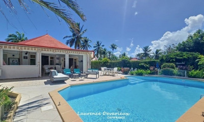Située dans un lotissement calme, prisé et sécurisé de Saint-François, à proximité immédiate du golf et du centre-ville, cette villa d'architecte construite en 2010 offre un cadre de vie rare, alliant confort moderne, tranquillité et nature. Avec ses 135 m² habitables, la maison séduit par sa belle luminosité et ses volumes bien pensés et aérés. Côté jour, l'entrée comprend un espace bureau/coin TV, un WC indépendant ainsi qu'un vaste séjour ouvert sur une cuisine américaine équipée, avec cellier attenant, qui s'étend naturellement vers une grande terrasse couverte de 55 m², idéale pour profiter pleinement de la douceur des extérieurs en toute intimité. Côté nuit, une suite parentale avec dressing, salle d'eau et balcon privé, ainsi que deux chambres en rez-de-jardin partageant une salle d'eau. À l'extérieur, une grande piscine à débordement au sel (8,5 x 4 m) entourée d'un beau deck en bois rouge vous invite à la détente. Tous les équipements techniques sont récents. L'atout majeur de cette propriété : un jardin exceptionnel de 1 739 m², sans vis-à-vis, magnifiquement arboré et bordé par une zone naturelle protégée. Vous y découvrirez une grande variété d'essences tropicales (palmier rouge, palmier bismarck, grenadier, baobab..) dans une atmosphère apaisante et confidentielle. Un grand carport permet de stationner deux véhicules à l'abri. La propriété est équipée d'un système d'alarme, visiophone et contrôle d'accès de dernière génération et entièrement clôturée avec portillon et portail automatique. Possibilité de séparer les deux chambres du bas pour les rendre indépendantes ou d'ajouter une construction. Un bien rare, où calme, nature et sérénité se rencontrent à quelques minutes du centre.