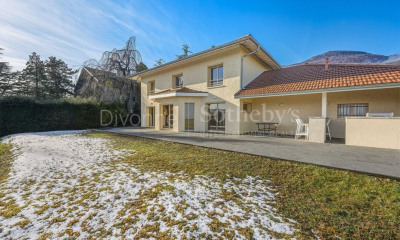 A Divonne-les-Bains, dans le secteur prisé de Villard, découvrez cette magnifique maison individuelle T6 entièrement rénovée. Elle offre plus de 178 m² habitables pour 235 m² utiles et est édifiée sur une vaste parcelle de prés de 1100 m². Nichée dans une impasse calme et bordée par un champ agricole, elle bénéficie d'un environnement paisible et verdoyant. La maison propose un bel espace de vie lumineux, largement ouvert sur l'extérieur grâce à ses grandes baies vitrées, et agrémenté d'une cheminée conviviale. La cuisine semi-ouverte est entièrement équipée et parfaitement intégrée à la pièce principale. Le rez-de-chaussée dispose également de deux chambres de plain-pied pouvant aisément être transformées en bureau ou salle de jeux, ainsi qu'une salle d'eau moderne et des toilettes séparées. À l'étage, vous trouverez deux chambres spacieuses et une élégante salle d'eau. La suite parentale, véritable coup de cœur s'étend sur plus de 30 m² et offre une vue panoramique sur les montagnes et le jardin. Elle s'agrémente d'un dressing séparé et d'une salle de bain élégante tous deux baignés de lumière naturelle grâce à leurs fenêtres. L'étage inférieur abrite un appartement indépendant de type T2 de 32 m² avec sa propre cuisine, une salle d'eau et un espace extérieur avec petite terrasse idéal pour accueillir des proches ou générer un revenu locatif. À l'extérieur, une belle terrasse orientée sud-est surplombe le jardin clos et arboré, parfait pour profiter de moments en plein air. La propriété dispose également d'un grand garage et de nombreuses places de stationnement extérieures. Cette maison se distingue par ses prestations de qualité et son confort moderne. Elle est équipée d'une climatisation réversible, d'une pompe à chaleur avec ballon thermodynamique, d'un adoucisseur d'eau et de la fibre optique. Son classement énergétique en B garantit une excellente performance énergétique. Son emplacement privilégié dans une impasse au calme et à proximité de la nature en fait une opportunité rare sur le marché immobilier de Divonne-les-Bains. Les honoraires sont à la charge du vendeur. Les informations sur les risques auxquels ce bien est exposé sont disponibles sur le site Géorisques : georisques. gouv. fr. Contactez Damien BOURGEOIS Entrepreneur Individuel, Agent commercial OptimHome (RSAC N°529 898 793 Greffe de BOURG EN BRESSE) (réf. 596856 )