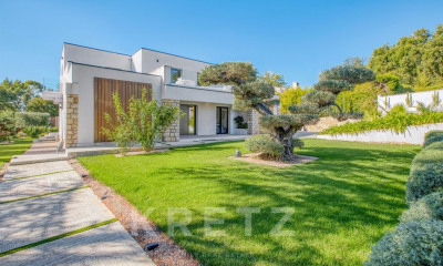 Située entre les deux communes de Biot et Valbonne. Villa contemporaine d'une surface habitable d'environ 185 m² sur deux niveaux : REZ-DE-CHAUSSÉE : Entrée, vestiaire invités et toilettes, cellier, buanderie. Grand salon, salle à manger et belle cuisine ouverte. Toutes les pièces donnent sur une grande terrasse et la piscine. La partie nuit comprend deux chambres avec une salle de bain et toilettes et une suite parentale avec dressing et salle de bain, salle d'eau et toilettes. 1ER ÉTAGE : Une chambre s'ouvrant sur une terrasse privative, une salle de bain. Un terrain de 2050 m² entièrement clos. Une piscine à débordement en résine. Un garage pour deux voitures.