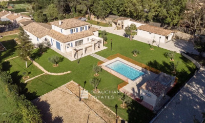 Mouans-Sartoux, secteur de l'Argile : Majestueuse villa provençale moderne construite en traditionnelle en 2005. Elle est implantée sur une parcelle de terrain de 2608m2 au calme avec une piscine de dimensions 17m X 5m. La villa se démarque par ses grandes pièces dont un espace séjour, salon, salle à manger de 80m2 avec de grandes baies vitrées ouvrant sur la piscine. Belle cuisine familiale de 30m2 aménagée et équipée. Une chambre en suite de plain-pied de 32m2. A l'étage, bel espace de travail bureau bibliothèque de 23m2, 3 chambres en suite. Salle de jeux de 40m2, garage de 35m2, buanderie, cave. Construction et prestations intérieures de bonnes factures dans un environnement calme offrant une agréable vue dégagée sur les collines.