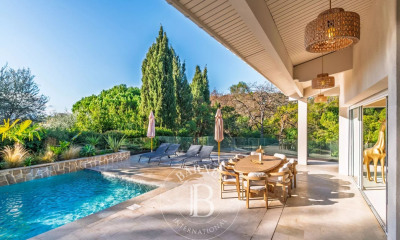 Située dans un cadre calme et privilégié au bout d’une route privée, cette lumineuse villa de 280 m² offre une vue spectaculaire sur la mer, la baie de Cannes et le massif de l’Estérel. Baignée de lumière grâce à son exposition plein sud et entourée d’un écrin de verdure, elle combine parfaitement intimité, confort et prestations haut de gamme. Implantée sur un terrain paysager d’environ 3 000 m², la propriété dispose d’une piscine chauffée, d’un terrain de pétanque, d’une table de ping-pong, ainsi que de plusieurs espaces de détente. Une maison d’amis indépendante avec salle de bains complète ce lieu d’exception. La maison principale s’ouvre sur un vaste séjour avec cuisine ouverte et espace repas, prolongé par une terrasse offrant une vue panoramique. Au même niveau, deux chambres avec accès direct au jardin et une salle de bains complètent ce premier espace de vie. Au niveau inférieur, vous découvrirez trois chambres supplémentaires, deux salles de bains, un second salon modulable (idéal bureau ou chambre supplémentaire) et une buanderie. Côté stationnement, un abri voiture ainsi que plusieurs places extérieures sont à disposition. À seulement quelques minutes des commerces, restaurants, boulangeries, golfs et courts de tennis, cette villa est idéale pour une grande famille ou pour recevoir avec confort dans un cadre exceptionnel.