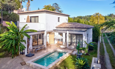 A quelques minutes de Mougins, dans un environnement calme et verdoyant, cette belle bastide moderne offre de lumineuses pièces de vie ouvertes sur un très agréable jardin paysager et complanté d'essences méditerranéennes. La propriété composée de la villa principale et d'un studio indépendant propose cinq chambres au total. Une piscine élégante avec son pool house avec cheminée et un véritable terrain de boules permettent de profiter des plaisirs extérieurs.