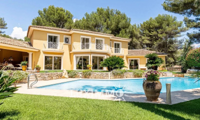 ** EXCLUSIVITE ** Située au cœur de l’un des quartiers résidentiels les plus prisés de Mougins, cette propriété de caractère bénéficie d’un cadre calme et verdoyant avec une vue dégagée sur les collines et un aperçu mer. La villa principale d’environ 305 m², conçue par un architecte, s’étend sur trois niveaux et séduit par ses volumes généreux. Le rez-de-jardin comprend une entrée, une cuisine entièrement équipée avec cellier et une salle à manger familiale s’ouvrant sur une terrasse. En légère surélévation, un salon télévision et un vaste double séjour avec cheminée et hauteur sous plafond remarquable donnent directement sur les espaces extérieurs. À l’étage, un bureau en mezzanine domine les pièces de vie. Ce niveau accueille également une chambre avec salle de bains, des toilettes indépendantes et une suite parentale avec salle de bains, dressing, toilettes et mezzanine. Le dernier étage offre une chambre supplémentaire avec salle de bains et toilettes. La propriété dispose de plusieurs dépendances offrant de nombreuses possibilités : une maison annexe de 41 m² composée de deux appartements indépendants, une maison d’amis de 25 m² surplombant la piscine, un atelier de 38 m² intégrant un appartement et un garage, ainsi que divers espaces de rangement. Établie sur un terrain paysager d’environ 6 900 m², elle comprend une piscine chauffée et faïencée, un vaste pool house avec cuisine d’été et bar, de nombreuses terrasses, un garage pour quatre véhicules et divers aménagements extérieurs. La climatisation réversible, le double vitrage et l’arrosage automatique complètent les prestations. Bien rare sur le marché, cette propriété offre un cadre de vie privilégié, alliant intimité, volumes et potentiel, idéale pour une grande résidence familiale ou une demeure de réception à Mougins.
