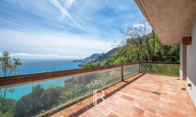 À vendre Roquebrune-Cap-Martin : villa provençale avec vue panoramique mer et Monaco Située sur les hauteurs résidentielles de Roquebrune-Cap-Martin, cette propriété bénéficie d'un emplacement privilégié, au calme absolu et sans vis-à-vis, offrant une vue panoramique exceptionnelle sur la mer Méditerranée, de l'Italie à Monaco. Construite en 1983 sur un terrain clos et paysager de 2 100 m², la villa développe une surface habitable d'environ 400 m² répartie sur plusieurs niveaux, tous orientés plein sud. Son architecture traditionnelle s'intègre harmonieusement au terrain en restanque, assurant à chaque étage une ouverture sur la mer. Le niveau principal se compose d'un vaste séjour lumineux avec cheminée, prolongé par une terrasse avec vue mer, d'une salle à manger attenante et d'une cuisine indépendante entièrement équipée. La villa dispose de cinq chambres, chacune avec sa propre salle de bains privative, ainsi que d'un bureau, d'une buanderie, de nombreux espaces de rangement et de six toilettes. Un espace de vie supplémentaire a été aménagé au niveau de la piscine : il comprend un salon avec cheminée, une cuisine équipée et des sanitaires, parfait pour accueillir en toute autonomie. À l'extérieur, la piscine bénéficie d'un ensoleillement optimal et s'intègre parfaitement dans l'environnement naturel. Le jardin, planté d'essences méditerranéennes, offre une atmosphère paisible et préservée. Prestations : menuiseries coulissantes en aluminium, cheminée, portail motorisé, système d'alarme, exposition plein sud, stationnement pour plusieurs véhicules avec abri couvert et cinq places extérieures. Cette propriété est située à seulement 15 minutes de Monaco et 40 minutes de l'aéroport international de Nice, dans l'un des secteurs les plus recherchés de la Côte d'Azur. Côte d'Azur Sotheby's International Realty se tient à votre disposition pour organiser une visite et vous accompagner dans la découverte de biens de prestige à Roquebrune-Cap-Martin et sur tout le littoral azuréen.