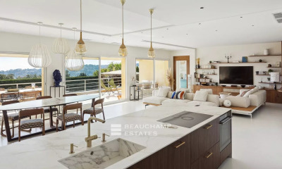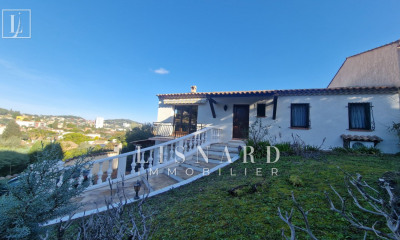 Venez découvrir cette villa d'exception avec vue mer imprenable, située dans un cadre calme et paisible au cœur d'une impasse. Avec ses 260 m² de surface et son terrain de 2100 m² entièrement rénové, elle offre un confort inégalé et un véritable art de vivre. Au rez-de-chaussée, vous serez séduit par sa grande pièce de vie lumineuse composée d'un salon cosy, d'une salle à manger accueillante et d'une cuisine américaine moderne, idéale pour vos moments conviviaux en famille ou entre amis. Vous y trouverez également deux chambres en suite, chacune avec sa salle de bain privative et ses placards, ainsi qu'une buanderie et des WC séparés. Le rez-de-jardin, quant à lui, propose un espace encore plus spacieux avec deux chambres supplémentaires, une salle d'eau, un bureau pour télétravail ou loisirs, et une pièce de vie aménageable en suite parentale selon vos envies. Vous pourrez profiter de multiples terrasses ensoleillées pour vos repas en extérieur ou vos moments de détente. À l'extérieur, une piscine à débordement, un terrain de pétanque et un jardin magnifiquement agencé vous attendent pour des moments de détente et de convivialité. Un garage, un carport et plusieurs places de stationnement complètent l'ensemble. La villa est équipée de domotique, chauffage au sol, pompe à chaleur, climatisation et borne électrique pour un confort optimal et une gestion énergétique performante. Une véritable perle rare à découvrir absolument ! Référence agence : 1014