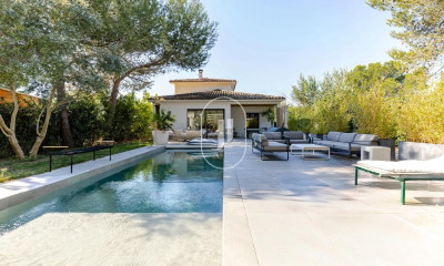 Nichée au cœur de la très prisée commune de Saint-Marc-Jaumegarde, à seulement quelques minutes du centre historique d'Aix-en-Provence, cette propriété d'exception incarne l'alliance parfaite entre charme ancien et confort contemporain. Derrière ses pierres chargées d'histoire, ce mas du XVIIIe siècle, entièrement rénové avec des matériaux nobles et authentiques, révèle des espaces de vie lumineux, chaleureux et élégants, pensés pour un art de vivre provençal raffiné. La demeure développe environ 300 m², répartis sur deux niveaux, et se niche au cœur d'un parc arboré de 4 660 m² offrant une rare intimité, dans un écrin de verdure parfaitement entretenu. Au rez-de-chaussée, les pièces de vie s'articulent autour de plusieurs espaces ouverts sur l'extérieur : une cuisine entièrement équipée avec arrière-cuisine et coin repas, prolongée par de vastes terrasses donnant sur la nature environnante ; une salle à manger intimiste, idéale pour recevoir dans une ambiance feutrée ; un vaste salon avec cheminée en pierre, ouvert sur la terrasse ombragée par une pergola végétalisée ; un salon avec home-cinéma et mezzanine, facilement aménageable en suite. Sur ce même niveau, une chambre d'amis spacieuse, une chambre d'enfant et une salle d'eau composent un espace nuit indépendant. À l'étage, l'espace nuit principal accueille une superbe suite parentale dotée d'un immense dressing avec salle d'eau, entièrement aménagé de placards en chêne massif, une salle de bain et un bureau. En complément, deux autres chambres, chacune avec salle de bain, et dont l'une dispose d'une terrasse tropézienne avec vue dégagée sur la végétation. Au dernier étage, un vaste bureau (ou salle de jeux/dortoir) avec nombreux rangements, occupe les combles, ajoutant un espace fonctionnel et polyvalent. Le parc paysager propose plusieurs espaces de détente, une piscine à débordement de 12x5.5 m avec cascade, une cuisine d'été avec four à pizza, une douche extérieure et une terrasse avec coin barbecue. Un garage, un abri pour trois véhicules, une authentique cave à vin voûtée et un grenier viennent compléter ce bien rare, idéalement situé aux portes d'Aix-en-Provence. Ce mas de charme, discret et élégant, séduit par son authenticité préservée, la qualité de sa rénovation, et son cadre naturel privilégié, parfait pour les amoureux de tranquillité, de caractère et de nature, à deux pas des commodités et des axes de communication. Maison à vendre par notre agence immobilière d'Aix-en-Provence. Grâce à notre partenariat exclusif avec Knight Frank, leader mondial de l'immobilier de prestige, Janssens Immobilier offre à chaque propriété une visibilité internationale exceptionnelle. Cette alliance renforce notre expertise locale par la puissance d'un réseau présent dans plus de 50 pays. Les informations sur les risques auxquels ce bien est exposé sont disponibles sur le site Géorisques : Conformément à la réglementation en vigueur, la surface DPE de ce bien est établie sur la base d'un mesurage normé de la surface habitable. Ce mesurage peut différer de la surface totale mesurée avec précision par nos équipes commerciales.