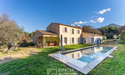 TRETS - ENSEMBLE IMMOBILIER - T8 - PISCINE - GARAGE - POOL HOUSE - VUE SAINTE VICTOIRE - À Trets, se dresse un véritable écrin immobilier de 220 m², où l'harmonie entre l'architecture et la nature crée un cadre de vie d'exception. Du haut de ce domaine, la vue imprenable sur la majestueuse montagne Sainte-Victoire et le Mont Aurélien se déploie, comme une toile vivante, changeant au fil des saisons et des lumières. Ce bien d'exception s'accompagne, en rez-de-chaussée, d'un appartement T3 de 70 m², parfait pour accueillir vos proches, offrir un havre de paix à vos invités ou même envisager une activité de location saisonnière, dans ce cadre idyllique. L'espace s'articule avec harmonie, offrant d'abord un appartement T3 indépendant de 70 m², véritable cocon de sérénité. Il se compose de deux chambres accueillantes, d'une pièce de vie baignée de lumière, agrémentée d'une cuisine ouverte, et d'une salle d'eau élégante. À l'extérieur, une belle terrasse et un jardin verdoyant viennent parfaire cet univers paisible, où chaque instant semble suspendu dans le temps. La maison principale s'élève ensuite, avec une vaste pièce de vie ouverte, propice à la convivialité, qui s'ouvre sur une terrasse magnifique et sur l'espace piscine, véritable invitation à la détente, se dévoile comme un écrin de fraîcheur. La Master room, intime et raffinée, est dotée d'un dressing spacieux et d'une salle d'eau élégante, tandis que deux autres chambres se partagent une salle d'eau moderne, tout en subtilité. Le pool house, avec son atmosphère chaleureuse, abrite une chambre intime avec sa salle d'eau, ainsi qu'une cuisine d'été couverte. La piscine, sublime joyau orné de pierres de Bali, se fond parfaitement dans ce tableau, offrant une vue imprenable sur les monts environnants, comme un miroir de la nature. Un double garage, discret mais fonctionnel, complète cette propriété d'exception, et la climatisation ajoute à ce lieu un confort sans égal. Un véritable havre de paix, où la beauté et la tranquillité se mêlent en parfaite harmonie. Contactez votre Agent AXO - L'immobilier Actif , L'Agence Côté Sud Aix en Provence Négociatrice en Immobilier Salariée. Plus d'informations (réf. 85002120173). Prix TTC et Honoraires à charge vendeur TTC. Les informations sur les risques auxquels ce bien est exposé sont disponibles sur le site Géorisques :
