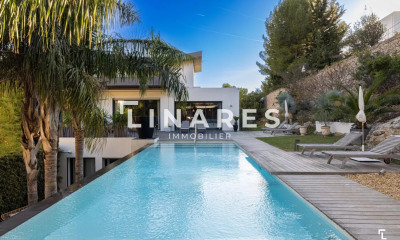 Le Groupe FIC vous présente en exclusivité une villa dessinée par André Stern, au calme absolu, en position dominante au sein d'un domaine privé et sécurisé du Roucas Blanc. Cette propriété d'exception de 494 m² habitables, répartis sur trois niveaux, offre une vue mer panoramique ininterrompue depuis chaque étage. Les vastes baies vitrées inondent les intérieurs de lumière naturelle. La villa est actuellement configurée en trois espaces de vie indépendants, chacun avec son entrée et ses aménagements distincts (cuisines, salles de bains, chambres). Ces espaces peuvent être aisément regroupés pour créer une seule et vaste résidence, grâce à une conception architecturale pensée pour l'adaptabilité. La propriété dispose de deux piscines, les terrasses multiples, exposées idéalement, permettent de profiter pleinement de la vue. Dix places de parking privatives viennent compléter cette opportunité unique dans ce quartier recherché.