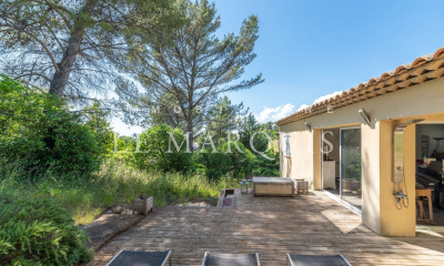 ** EN EXCLUSIVITÉ ** ** SECTEUR DES CAMOINS ** ** CALME ABSOLU AVEC UNE VUE IMPRENABLE ** Il est des maisons qui séduisent dès les premiers instants? Cette villa moderne en fait partie. Vous aimez les lignes contemporaines, la lumière et les prestations soignées ? Vous recherchez un bien au calme, fonctionnel et chaleureux ? Ne cherchez plus., nous l'avons trouvé pour vous.. Édifiée sur un terrain de 1 000m2 parfaitement entretenu avec véritable gazon, cette villa de 170m2 environ offre un cadre de vie paisible et convivial, sublimé par une architecture moderne et des matériaux de qualité. Au rez-de-chaussée : Une salle à manger entièrement vitrée ouverte sur la terrasse, une cuisine séparée avec porte à galandage , un salon chaleureux avec cheminée à foyer ouvert, ainsi qu'un bureau/chambre avec salle d'eau et toilette. À l'étage : Dans une ambiance mêlant poutres apparentes et béton ciré, vous trouverez deux chambres, une salle de bain, un toilette indépendant, un placard, et une superbe suite parentale avec salle de bain, deux dressings et wc. Extérieurs : Piscine 7 × 3,5 m chauffée et au sel avec filtration automatisée, terrasse bois refaite entièrement en 2024 avec une vue à couper le souffle sur les collines, cuisine d'été (four à pizza, bar, barbecue pierre), terrain de pétanque, garage avec mezzanine, buanderie isolée et cave climatisée. D'un point de vue technique : Chauffage au sol, thermostats indépendants, volets roulants électriques (système de centralisation), alarme, raccordement au tout à l'égout, portail électrique et visiophone assurent un confort optimal. Diagnostics DPE C et aucune anomalie électrique. Une belle villa moderne, pensée pour vivre dedans comme dehors, en toute sérénité. Pour plus d'informations, contactez l'agence et demandez Laurie.