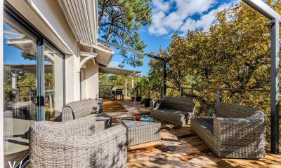 Le charme, la lumière, la nature et les plages du Pyla à 5 minutes! Un cadre de vie idyllique, un art de vivre Bassin! Villa T5 de 160 m2, baignée de soleil avec une exposition plein Sud face à une vue imprenable sur la forêt. On pousse la porte, et on tombe sous le charme. Vous y trouverez une cuisine lumineuse de qualité ouverte sur le séjour/salon le tout sur une belle terrasse, 4 chambres dont une suite parentale avec salle de bains, une salle d'eau moderne, 2 wc séparés. A l'extérieur, un véritable cocon : Jardin paysagé, piscine entourée d'une terrasse XXL de 200 m2, parfaite pour les longues soirées d'été. Garage de17 m2, une buanderie de 39 m2.