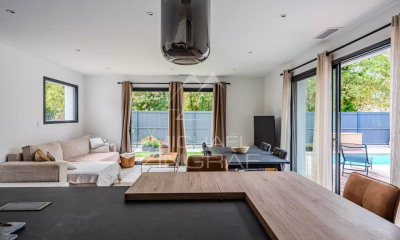 GUJAN-MESTRAS. Nichée dans un quartier résidentiel calme et recherché de Gujan-Mestras, à proximité des commodités, cette magnifique maison de style Arcachonnais construite en 2021 conjugue élégance, confort moderne et qualité de vie. Elle bénéficie de la garantie décennale, d'une assurance dommage-ouvrage, répond à la norme RT 2012 et affiche un excellent DPE en A. Dès l'entrée, laissez-vous séduire par une vaste pièce de vie lumineuse de 55 m² avec belle hauteur sous plafond et poutres apparentes, idéale pour recevoir. La cuisine ouverte, à la fois fonctionnelle et raffinée, s'intègre parfaitement à l'espace de vie. Le rez-de-chaussée offre deux suites parentales, dont une avec dressing, pour un confort absolu au quotidien. À l'étage, deux chambres supplémentaires ainsi qu'une salle de bains complètent ce bien familial et harmonieux. Prestations haut de gamme : climatisation réversible gainable, cellier, garage, matériaux nobles et finitions soignées. À l'extérieur, vous profiterez d'un magnifique jardin paysager avec piscine chauffée exposée plein Sud, bordée d'une superbe terrasse en travertin, dont une partie est couverte pour savourer des moments de détente à l'abri du soleil ou partager des repas conviviaux en toute saison. Un bien rare, qui allie le charme de l'architecture du Bassin à des prestations contemporaines de grande qualité. À visiter sans tarder ! Contactez-nous ou Les informations sur les risques auxquels ce bien est exposé sont disponibles sur le site Géorisques : georisques. gouv. fr. Montant estimé des dépenses annuelles d'énergie pour un usage standard : entre 550 et 770 Euros/an (année de référence 2021)
