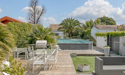 LA TESTE - CENTRE - GRANDE MAISON DE VILLE DE STYLE BOURGEOIS DE 241M2 – 5 CHAMBRES – PISCINE Coup de cœur assuré pour cette superbe maison de ville datant de 1901, alliant le charme de l'ancien et le confort moderne. Située en plein cœur de La Teste-de-Buch, elle séduit par ses volumes généreux, ses belles hauteurs sous plafond, ses poutres apparentes et ses tommettes. À cela s'ajoutent de magnifiques terrasses et une piscine, parfaites pour profiter des beaux jours. Les espaces de vie : Au rez-de-chaussée : • Séjour/salon lumineux de 30,7 m² avec cheminée • Grande cuisine équipée ouverte sur la salle à manger (41 m²) • Suite parentale de 18,5 m² avec salle de bains/douche/WC de 5,5 m² • Bureau, hall d'entrée, buanderie et cellier attenant à la cuisine À l'étage : • Une suite parentale avec dressing et salle d'eau/WC • Une deuxième suite parentale avec salle d'eau/WC • Deux grandes chambres • Une salle de bains avec douche À l'extérieur : L'espace extérieur est un véritable atout avec ses belles terrasses, dont une semi-couverte attenante à la salle à manger, idéale pour des repas conviviaux. La seconde terrasse, plus vaste, accueille une piscine intimiste pour des moments de détente en toute tranquillité. Une situation idéale : Cette maison d'exception bénéficie d'un emplacement privilégié, à proximité immédiate des commerces et services de La Teste-de-Buch, tout en étant à quelques minutes seulement du Bassin d'Arcachon, de ses plages et de ses activités nautiques. Un bien rare aux prestations haut de gamme à découvrir sans tarder !