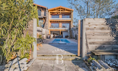 À quelques minutes de la dune du Pilat, au coeur d'un quartier résidentiel paisible de La Teste-de-Buch, cette maison d'architecte sur deux étages développe près de 245m² sur un terrain paysagé de 827m². Sa silhouette singulière, soulignée par une toiture originale, affirme dès l'extérieur son caractère unique. L'étage principal, accessible par escalier ou monte-charge, s'ouvre sur un vaste salon-séjour baigné de lumière, avec cuisine ouverte. Deux chambres, un bureau, une salle de bain et une suite parentale avec dressing, salle d'eau et vue sur la véranda complètent cet espace de vie convivial et bien pensé. Un poêle à bois vient réchauffer l'ambiance et ajoute un cachet chaleureux à l'espace de vie. Le rez-de-chaussée dispose d'un garage, d'une cuisine d'appoint, d'une salle de jeux, d'une cave à vin et d'une salle d'eau, parfaits pour une vie familiale ou l'accueil d'invités. A l'extérieur, une vaste terrasse accueille une piscine au brome avec nage à contre-courant et dôme rétractable, prolongée par un espace jacuzzi intégré sous véranda. Les aménagements paysagers offrent un cadre de vie tourné vers la détente, avec un pool house aménagé pour vivre en extérieur l'été. Le bien bénéficie d'un accès rapide aux commerces, écoles, transports et axes principaux, tout en offrant une proximité privilégiée avec la nature et le bassin d'Arcachon. CLASSE ENERGIE : D/ CLASSE CLIMAT : B. Montant moyen estimé des dépenses annuelles d'énergie pour un usage standard, établi à partir des prix de l'énergie de l'année 2021 : entre 1 780 et 2 480 €. Julie Martin (EI) Agent Commercial ? n° RSAC Bordeaux 930 668 629. (3.85 % d'honoraires TTC à la charge de l'acquéreur.) Julie MARTIN (EI) Agent Commercial - Numéro RSAC : 930 668 629 - Bordeaux.