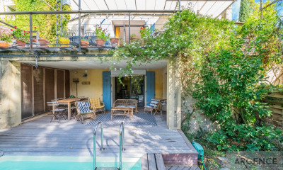 Le Cabinet ARGENCE & ARGENCE Immobilier vous présente, dans un environnement calme et recherché, cette maison familiale d'environ 165 m², rénovée avec soin par un architecte en 2021. Édifiée sur un terrain paysager de plus de 1 000 m², elle offre un cadre de vie privilégié, à quelques minutes des écoles, du collège et du tramway. Principalement organisée de plain-pied, la villa s'ouvre sur un hall d'accueil avec rangements. Les espaces de vie, baignés de lumière grâce à de larges ouvertures, comprennent un salon chaleureux agrémenté d'une cheminée et d'une belle hauteur sous plafond, ainsi qu'une spacieuse cuisine récente entièrement aménagée. Une buanderie/arrière-cuisine attenante facilite le quotidien, et une salle à manger ouverte prolonge l'ensemble vers la terrasse et la piscine. La partie nuit du rez-de-chaussée se compose de quatre chambres dont une suite parentale, accompagnées d'une salle de bain et d'un WC indépendant. À l'étage, une chambre mansardée climatisée avec son propre espace d'eau, WC et dressing offre un lieu idéal pour recevoir famille ou invités en toute intimité. À l'extérieur, le jardin arboré accueille une piscine, un double garage et des stationnements privatifs pour trois véhicules, complétés par un portail automatisé. Un bien rare dans le secteur, alliant modernité, fonctionnalité et emplacement de qualité.