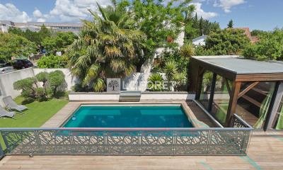 Contact : Ivan BUCHEL Nichée au calme, au cœur d'un environnement verdoyant et face au golf, cette villa contemporaine de 230 m² conjugue avec finesse architecture moderne, confort et respect de l'environnement. Sa silhouette contemporaine s'intègre harmonieusement sur un terrain plein sud de 1 400 m². Imaginée par un architecte, cette résidence bioclimatique à double orientation Nord-Sud capte la lumière tout au long de la journée et valorise des volumes parfaitement maîtrisés. Dès l'entrée, un séjour lumineux de 70 m² s'ouvre grâce à de larges baies vitrées à galandage, offrant une vraie continuité entre l'intérieur et les espaces extérieurs. La terrasse d'été accueille une cuisine extérieure équipée ainsi qu'une pergola bioclimatique, idéale pour profiter de la belle saison. Une terrasse d'hiver, pensée comme un jardin intérieur vitré, permet de profiter du cadre extérieur toute l'année. La cuisine dînatoire en silestone, parfaitement équipée, s'intègre naturellement à l'espace de vie. Sur ce même niveau, une chambre avec salle d'eau privative, ainsi qu'un bureau, complètent l'ensemble et offrent un confort de plain-pied particulièrement recherché. À l'étage, la suite parentale propose un espace généreux et lumineux, complété par un dressing sur mesure et une terrasse-solarium de 25 m² avec une vue dégagée. Deux chambres supplémentaires avec rangements intégrés ainsi qu'une salle de bains indépendante complètent l'étage. La villa se distingue également par ses prestations haut de gamme : climatisation réversible, pompe à chaleur, carrelage italien, parquet massif, salles d'eau Porcelanosa, mobilier sur mesure. La piscine balinaise chauffée, de 8 × 6 mètres, s'inscrit au cœur d'un jardin sans vis-à-vis, propice à la détente. Les annexes apportent un véritable confort de vie : salle de jeux de 25 m², salle de sport équipée de 21 m², buanderie, atelier, cave à vin, ainsi qu'un double garage carrelé complété par plusieurs stationnements extérieurs. Le jardin méditerranéen, soigneusement paysagé, accueille palmiers, oliviers, cactus, essences locales et espaces de détente variés : boulodrome, coin zen, zones ombragées ou ensoleillées. L'ensemble crée une atmosphère paisible et agréable au quotidien. Cette villa offre un cadre de vie rare, fonctionnel et élégant, adapté aussi bien à une résidence principale qu'à une maison secondaire, pour celles et ceux qui recherchent un bien moderne, lumineux et parfaitement entretenu.