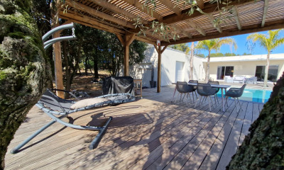 Saint Gely du Fesc. Villa contemporaine d'environ 400m2 sur un terrain arboré de 2500m2, dans un environnement privilégié, au calme et sans vis à vis. Rdc : séjour de plus de 100m2 ouvrant largement sur les terrasses et sur la piscine à débordement, offrant une vue sur la nature, cuisine américaine haut de gamme, suite parentale, bureau. 1er étage : 2 suites avec vue. Rez de jardin : 1 suite, studio indépendant, salle de cinéma, sauna, cave à vin. Double garage et nombreux stationnements. Domotique, chauffage au sol, climatisation gainable, forage. A 5mn de tous commerces, écoles et à 10mn de Montpellier.