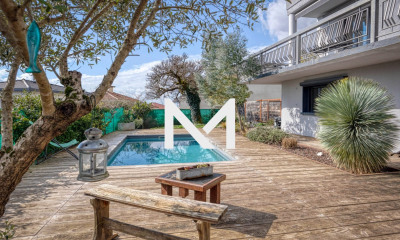 Elégante maison d'architecte de 1988 aux lignes intemporelles positionnée face à Belledonne sur un terrain plat de 1222 m² dont les plantations soignées assurent une vraie intimité. D'une surface habitable de 170 m² (surface totale de 180 m²) elle est édifiée sur deux niveaux complétés d'un sous-sol partiel. Le rez-de-jardin accueille une belle pièce de séjour avec cuisine ouverte et cheminée contemporaine ainsi qu'une chambre équipée d'une salle de bains avec toilettes. Grandes baies vitrées et élégant claustra rappelant les granges à noix du Dauphiné. A l'étage se trouvent une grande pièce traversante à usage de bureau ou salon TV face à un beau panorama, trois chambres, une salle de bains, une salle d'eau et des toilettes. Kitchenette d'appoint et nombreux rangements. Vues imprenables sur la Chartreuse et sur la chaîne de Belledonne. Agréable terrain arboré avec une piscine de 10 m x 4,5 m à l'abri des regards. Garage pour deux voiture (34 m²) avec douche et local technique. A proximité des école, collèges et commerces de Saint-Ismier cette maison aux lignes épurées constitue une très belle offre aujourd'hui sur le marché du Grésivaudan. Position idéale entre deux importantes villes : Grenoble centre à 15' par la voie expresse et Chambéry à 40'. Prix de vente : 895 000 € Honoraires à la charge du vendeur Classe énergie : D Classe climat : D Montant estimé des dépenses annuelles d'énergie pour un usage standard : entre 3 460 euros et 4 730 euros par an. Prix indexés sur les années 2021, 2022 et 2023. Les informations sur les risques auxquels ce bien est exposé sont disponibles sur le site Géorisques :