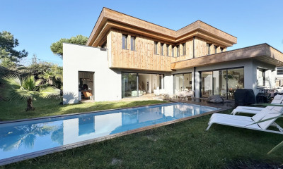 Au cœur du quartier prisé de Chiberta, à deux pas de Biarritz, cette villa contemporaine de 2016 signée par l’architecte californien Marc Whipple déploie près de 450 m² au sein d’un parc de plus de 4 000 m². Nichée parmi les pins, elle offre une vue panoramique sur l’océan et les golfs environnants. Baignée de lumière, la maison propose de vastes espaces de réception ouverts sur de larges terrasses, une suite parentale avec dressing et terrasse privée, trois chambres avec salles d’eau, un second salon donnant sur le jardin et la piscine, ainsi qu’une salle de sport, un home cinéma, un garage et un carport. Une adresse rare qui conjugue architecture moderniste californienne et art de vivre basque, à proximité immédiate des plages et des golfs.