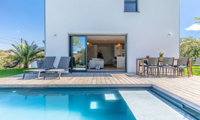 Située dans le quartier recherché d'Anglet Chiberta, découvrez cette magnifique maison contemporaine, neuve de fin 2023, mariant harmonieusement le béton et le bois. Avec une surface habitable de 215 m2, ce bien s'érige sur un terrain plat de 864 m2. L'intérieur est un savant mélange de sophistication et de convivialité, agrémenté de parquets en bois clair, tandis que les hauts plafonds ajoutent une touche d'élégance. Au rez-de-chaussée, un vaste salon baigné de lumière s'ouvre généreusement sur la terrasse et la piscine, une cuisine entièrement aménagée jouxte également l'espace piscine, accompagnée d'une salle à manger et son cellier, ainsi qu'une buanderie. Une suite avec salle de bain et douche. À l'étage, vous découvrirez la suite parentale avec dressing, salle d'eau et terrasse privée, une autre suite avec dressing et salle d'eau, ainsi qu'une chambre supplémentaire avec dressing mural et salle d'eau indépendante. À l'extérieur, une piscine de 11x3,5 m entourée d'une terrasse en bois offre un espace idéal pour se détendre en toute quiétude. Vous serez à 200m de la plage à pied, à proximité du golf de Chiberta. Cette villa offre un mode de vie des plus agréable..