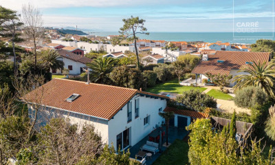 À 2 minutes à pied de la place de Quintaou et de la mairie d'Anglet, dans une impasse au calme, villa de 315 m² édifiée sur un terrain de plus de 650 m² agrémenté d'un spa de nage. Au niveau principal : lumineuse pièce de réception, spacieuse cuisine ouverte équipée, 3 chambres dont deux dotées de leur salle d'eau et toilettes, une salle de bains supplémentaire et toilettes d'invités. Au rez-de-jardin : appartement 2 pièces, cuisine et salle d'eau, toilettes séparées, espace buanderie, atelier/bureau, cave à vin, pièce annexe pour stockage divers. Combles de 20 m² aménagées en dortoir. Garage.