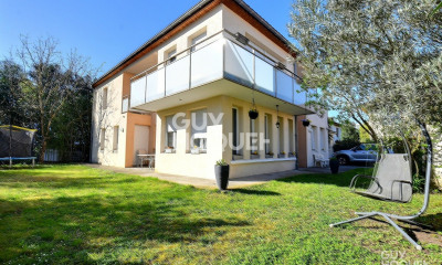 ORPI vous propose en exclusivité cette propriété d'exception située dans le secteur très prisé de Bron Église, au cœur d'un écrin de verdure, discret et sans vis-à-vis. Construite en 2006, cette maison contemporaine développe une surface habitable d'environ 220 m² sur trois niveaux, alliant confort, volumes généreux et prestations de qualité. Dès l'entrée, vous serez séduits par un vaste hall avec placards, qui donne accès à une cuisine aménagée et équipée, semi-ouverte sur un superbe salon-séjour cathédrale. Cette pièce de vie traversante Est/Ouest, baignée de lumière naturelle, s'ouvre sur deux terrasses, invitant à profiter du soleil tout au long de la journée. Un véritable lieu de convivialité, idéal pour les moments en famille ou entre amis. La maison propose également cinq chambres, dont une spacieuse suite parentale, trois salles de bains, trois WC indépendants, ainsi qu'un entresol pouvant être aménagé en logement indépendant selon vos besoins. À l'extérieur, vous bénéficierez de deux belles terrasses, d'une pergola, d'une piscine, ainsi que d'un garage fermé. Cinq stationnements extérieurs viennent compléter ce bien. Le confort est assuré par un chauffage individuel au gaz, complété par des panneaux solaires pour une meilleure performance énergétique. Référence agence : 1198
