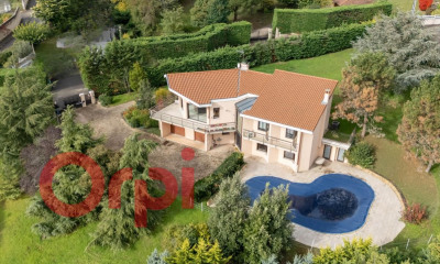 Splendide propriété de près de 5 000 m2 sur les hauteurs de Saint Genis Laval arborée, paysagée, entièrement close, à l'abri des regards et au calme avec piscine. Intimité, luminosité et espace pour cette superbe maison de caractère de type longère et d'inspiration Ile de France de 244 m2 habitables ouverte sur le parc offrant des prestations de grande qualité et proposant au rez-de-chaussée un vaste espace de vie en enfilade composé d'une grande entrée desservant un salon très lumineux en triple exposition avec cheminée à foyer fermé, une salle à manger, une grande cuisine semi-ouverte parfaitement aménagée et équipée, un cellier/buanderie, une chambre/bureau et un wc séparé. A l'étage, la maison propose quatre chambres dont un vaste espace parental indépendant composé d'une chambre, une salle de bains avec double douche à l'italienne, un dressing et un wc. Les trois autres chambres de grande taille desservies par un couloir avec wc séparé ont toutes une salle de bains ou d'eau privative. Nombreux rangements. Cave. Piscine chauffée avec volet de sécurité. Terrasses. Chalet. Portail automatisé. Visiophone. Alarme. Les honoraires sont à la charge du vendeur.