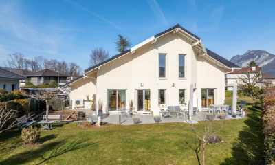 Villa de caractère d'environ 244 m² habitables nichée sur terrain plat et arboré de 2 076 m² ; idéalement située dans un secteur résidentiel proche du lac et jouissant d'une très belle vue dégagée sur les montagnes. Cette villa de belle facture et offrant de nombreuses possibilités d'aménagement est organisée comme suit: L'entrée comportant un vestiaire d'accueil mène à une cuisine équipée avec passe-plats, ainsi qu'à une spacieuse et lumineuse pièce de vie d'environ 49 m², baignée de lumière et largement ouverte sur le parc. Cet espace convivial, agrémenté d'une cheminée, se prolonge harmonieusement vers l'extérieur. Le rez-de-chaussée propose également deux chambres, une salle de douche, des toilettes séparées, ainsi qu'une suite parentale bénéficiant de sa propre salle de bains avec toilettes indépendant. À l'étage, une vaste mezzanine d'environ 70 m² offre un beau potentiel d'aménagement selon vos envies et besoins : bureau, salle de jeux, espace détente… Elle dessert par ailleurs une chambre supplémentaire ainsi qu'une salle de bains avec toilettes séparées. En complément, la villa dispose d'un grand sous-sol complet comprenant un garage avec porte automatique, une buanderie, un cellier et plusieurs caves. Le jardin, très largement arboré et végétalisé, accueille une piscine.