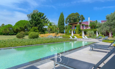 Entre mer et vignes, une adresse confidentielle lovée dans un hectare clos sans vis-à-vis où règnent calme absolu, lumière et essences méditerranéennes aux eucalyptus majestueux. La bâtisse principale sur deux niveaux déploie 420 m² et s'accompagne d'une cave, d'un studio de gardien, d'un abri voiture, d'un abri jardin et d'un atelier, l'accès se fait par une large esplanade menant à un parking discret accueillant aisément plusieurs véhicules. La configuration sépare avec élégance les espaces privés et les zones d'accueil, idéale pour une maison d'hôtes ou un petit hôtel de charme, treize pièces au total dont onze suites au décor chaleureux, neuf salles de bains, matériaux nobles et douce lumière du Sud pour une atmosphère de maison de famille. Au cœur du parc, une piscine miroir au sel chauffée prolonge les terrasses vers un pool house convivial, un véritable havre de détente dans une ambiance zen. Le confort est contemporain et durable, climatisations réversibles Daikin dans chaque pièce, chauffage au sol dans le séjour, excellente isolation, quarante panneaux solaires offrant l'autonomie électrique de jour, production d'eau chaude assurée par deux ballons et chauffage de la piscine, performance énergétique en classe A. L'eau est alimentée par le canal de Provence, gage de fiabilité, tandis que la proximité des plus belles plages du Var complète ce tableau rare où nature préservée, intimité et élégance s'accordent au quotidien.. Un lieu rare où nature préservée, confort contemporain et discrétion s'harmonisent parfaitement. Une opportunité singulière pour concrétiser un projet hôtelier raffiné ou s'offrir une résidence méditerranéenne d'exception.