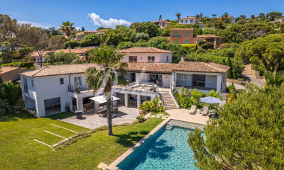 Découvrez cette magnifique villa de +/-400 m² située dans le cadre enchanteur de La Nartelle. à Sainte-Maxime. Avec ses 8 chambres et 12 pièces. cette propriété exceptionnellement spacieuse offre tout le confort moderne : climatisation. double vitrage. et un spacieux vide sanitaire. L'atmosphère conviviale est rehaussée par une cheminée chaleureuse. idéale pour des soirées en famille ou entre amis. À l'extérieur. vous profiterez d'un cadre idyllique avec une piscine scintillante. un jacuzzi relaxant. et un court de tennis pour les amateurs de sport. Les installations incluent également un barbecue intégré et une zone éclairée pour des dîners en plein air inoubliables. La propriété est parfaitement sécurisée avec un digicode. et les aménagements tels que le système d'irrigation et la clôture assurent une tranquillité d'esprit totale. La villa bénéficie d'une vue imprenable sur la mer Méditerranée. visible de la terrasse ombragée. C'est l'endroit idéal pour se détendre et profiter de la douce brise marine. Située à proximité immédiate des plages et des commodités locales. cette propriété unique allie luxe. confort et emplacement exceptionnel. Ne manquez pas cette opportunité rare d'acquérir une villa de rêve sur la Côte d'Azur.