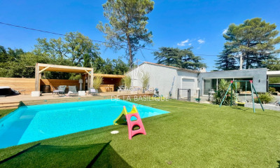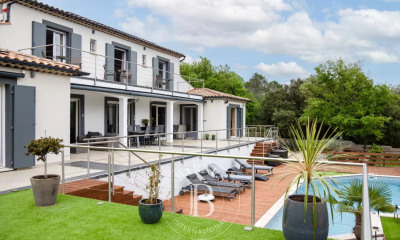 SAINT MAXIMIN LA SAINTE BAUME, 83470 VILLA CONTEMPORAINE HORS DU COMMUN/ GARANTIE DECENNALE Venez vite découvrir cette surprenante villa couleur '' Blanc de la Côte'', au style épuré d'inspiration Grecque d'environ 114 m². Ses lignes horizontales accentuent la modernité d'une construction avec toits plats et offre un prolongement intéressant de l'architecture qui permet de profiter de 108 m² de terrasses autour de la villa. Dès l'entrée, l'accueil est chaleureux grâce au choix du carrelage en pierre de Sardaigne qui unifie la pièce à vivre et se prolonge sur l'extérieur, ce qui favorise un effet INDOOR-OUTDOOR immédiat grâce aux larges baies vitrées à galandage.. Notre regard est attiré immédiatement sur une cheminée électrique XXL mise en valeur grâce à la Claire-voie en Noyer en arrière-plan qui offre un rappel élégant à la somptueuse cuisine également en NOYER : Entourée de panneaux muraux et plan de travail effet CALACATA ORO, nous avons l'impression d'être de vrais chefs étoilés.. On prolonge la visite dans la chambre spacieuse du Rez-de-chaussée avec dressing SUR-MESURE, à proximité, la salle de bains propose des WC Japonais, une douche et une incroyable baignoire îlot Ovale, entourée de panneaux Muraux effet Marbre Vert, Relaxation garantie. Pièce centrale de la villa : cet escalier en béton ciré beige qui s'accorde parfaitement à la décoration pure et naturelle et qui nous permet de découvrir à l'étage, deux jolies chambres avec accès privatifs au toit Terrasse avec vue sur le massif de la Sainte Baume et à l'intégralité de la parcelle de 2174 m², sur laquelle vous pouvez laisser court à votre imagination pour l'aménagement paysagé et la construction d'une piscine (déjà autorisée sur le Permis de construire) .. COUP DE COEUR ASSURE