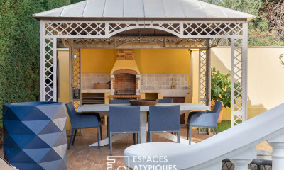Votre agence BERSAN Immobilier vous propose au coeur de Saint-Raphaël, cette villa de style Belle Époque, construite en 1896, séduit par son architecture emblématique et son emplacement central, à seulement quelques minutes à pied des plages, des commerces et de la gare. Entièrement rénovée avec goût et dans le respect de la bâtisse, elle offre un cadre de vie élégant, alliant le charme de l'ancien à des prestations contemporaines soignées. Derrière sa façade pleine de caractère, les volumes intérieurs bénéficient d'une belle hauteur sous plafond et d'une luminosité constante. Le séjour, organisé autour d'une cheminée moderne double face, propose une atmosphère chaleureuse et conviviale. La cuisine entièrement équipée s'ouvre sur la salle à manger, formant un espace de vie fluide et agréable. La villa dispose de plusieurs chambres confortables, ainsi que de salles de bains et d'une salle d'eau, pensées pour un usage quotidien fonctionnel et harmonieux. En rez-de-jardin, un appartement indépendant comprend une pièce de vie avec cuisine, une chambre et une salle d'eau avec hammam, idéal pour recevoir en toute autonomie ou pour un espace complémentaire. À l'extérieur, le jardin, à l'abri des regards, accueille un jacuzzi, un salon d'été couvert et un espace barbecue. Un carport permettant de stationner deux véhicules complète les prestations. Une propriété rare en centre-ville de Saint-Raphaël, conjuguant architecture Belle Époque, rénovation de qualité et emplacement privilégié. L'ensemble de l'équipe BERSAN Immobilier reste à votre service pour vous apportez de plus amples informations, une visite virtuelle "live" est également disponible.