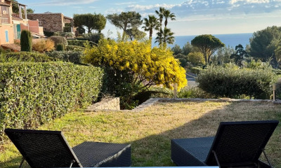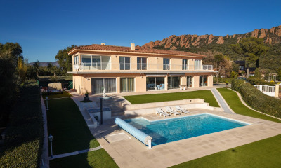 Propriété d'exception à vendre à Saint-Raphaël, nichée au pied du massif de l'Esterel et offrant une vue mer époustouflante et un panorama imprenable sur le village du Trayas. Édifiée sur un terrain paysager d'environ 1050 m², cette demeure allie élégance, confort moderne et cadre naturel privilégié. Le niveau principal s'ouvre sur un hall d'entrée menant à un vaste espace de vie particulièrement lumineux, comprenant un salon doté d'une cheminée moderne et ouvrant sur une terrasse abritée, une salle à manger attenante avec accès direct à l'extérieur, ainsi qu'une cuisine haut de gamme entièrement équipée, agrémentée d'un plan de travail en granit et d'un îlot central. La chambre de maître, spacieuse et élégante, dispose d'un dressing ainsi que d'une salle de bain privative. La terrasse principale, pourvue d'un store électrique, est reliée par un escalier au niveau piscine. Au rez-de-jardin, se trouvent trois chambres en suite, chacune bénéficiant d'une vue mer et d'un accès à la terrasse. Ce même niveau accueille également une buanderie ainsi qu'une chaufferie menant à une cave à vins. La maison dispose d'un chauffage central dans toutes les pièces, garantissant un confort optimal en toute saison. À l'extérieur, une piscine d'eau salée chauffée s'intègre harmonieusement à la terrasse plantée d'essences méditerranéennes et équipée d'un système d'irrigation automatique. Un grand garage de plus de 30 m² complète l'ensemble Véritable havre de paix alliant confort moderne et cadre naturel exceptionnel, cette propriété rare séduit par la qualité de ses prestations autant que par la beauté de son environnement. Propriété à vendre par l'agence immobilière Janssens immobilier de Sainte-Maxime. Grâce à notre partenariat exclusif avec Knight Frank, leader mondial de l'immobilier de prestige, Janssens Immobilier offre à chaque propriété une visibilité internationale exceptionnelle. Cette alliance renforce notre expertise locale par la puissance d'un réseau présent dans plus de 50 pays. Les informations sur les risques auxquels ce bien est exposé sont disponibles sur le site Géorisques : Conformément à la réglementation en vigueur, la surface DPE de ce bien est établie sur la base d'un mesurage normé de la surface habitable. Ce mesurage peut différer de la surface totale mesurée avec précision par nos équipes commerciales.