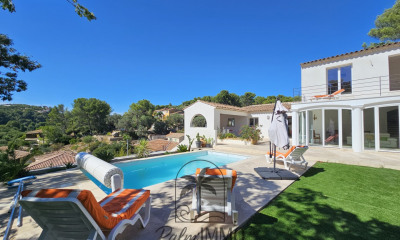 À seulement 10 minutes du port, du marché et des plages de Sanary-sur-Mer, découvrez cette superbe villa provençale de 142 m², implantée sur un terrain paysager de 1 116 m². Le jardin, magnifiquement aménagé, invite à la détente avec sa piscine, ses terrasses ensoleillées, sa cuisine d'été et ses espaces intimistes, le tout dans un environnement verdoyant et apaisant. Entièrement repensée avec goût, la maison offre en rez-de-jardin un vaste espace de vie baigné de lumière grâce à de larges baies à galandage s'ouvrant sur une grande terrasse prolongée par le jardin. Vous y trouverez également une grande cuisine conviviale, une suite parentale avec salle d'eau ainsi qu'un cellier. À l'étage, trois chambres lumineuses dont une avec balcon privatif et vue sur la campagne, complétées par une salle d'eau. Un carport, un abri de jardin et de nombreux espaces de rangement viennent parfaire les prestations de cette belle propriété. Une adresse rare, alliant charme provençal, confort et douceur de vivre à proximité immédiate des plus beaux atouts de Sanary-sur-Mer.