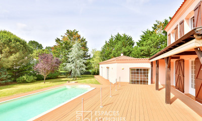 À Bourgenay, dans un environnement recherché à proximité de l'océan, du port, des commerces et du golf, venez découvrir cette superbe villa récente construite en 2023, aux prestations soignées et aux volumes généreux. Dès l'entrée, vous serez séduit par une vaste pièce à vivre lumineuse, sublimée par une cheminée, offrant un cadre chaleureux et convivial. La cuisine aménagée et équipée s'ouvre harmonieusement sur une terrasse couverte, idéale pour profiter des beaux jours en toute saison. Le rez-de-chaussée propose également une suite parentale avec salle d'eau et dressing, une seconde chambre, deux WC ainsi qu'une buanderie fonctionnelle. À l'étage, le palier dessert deux chambres avec placards, une salle d'eau, un WC indépendant et un dressing, offrant un espace nuit confortable et bien organisé. À l'extérieur, vous profiterez d'un garage attenant de 50 m², d'une piscine chauffée au sel, ainsi que d'une dépendance comprenant pool house et local technique. L'ensemble est implanté sur une belle parcelle entièrement clôturée de plus de 1 700 m², garantissant intimité et tranquillité. Une villa idéale pour une résidence principale ou secondaire, alliant confort moderne, espace et situation privilégiée. Référence agence : 3513