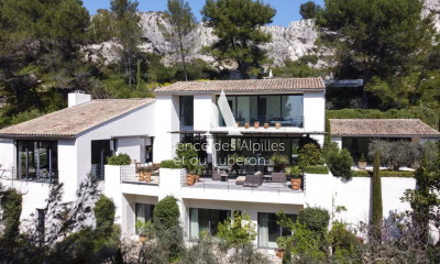 Sans être isolée, cette maison bénéficie d'un environnement exceptionnel : une vue dégagée sur la nature, les Alpilles, la roche et les arbres? un véritable havre de paix. Idéale pour se déconnecter et vivre au rythme de la Provence. 210 m2 de bâti: L'espace de vie 100 m2, baignée de lumière : une grande cuisine ouverte très fonctionnelle, une salle à manger et un salon/salle de cinéma cosy et chaleureux avec cheminée double-face. L'ensemble est orienté plein sud, avec de larges ouvertures offrant une vue panoramique sur les Alpilles et sur le jardin. La maison propose une grande suite de plain-pied, véritable cocon pour se réveiller face à la nature, comprenant une belle chambre, un espace bureau et une salle de bain.(baignoire balnéo et toilettes) et terrasse panoramique. Une seconde suite indépendante en rez-de-chaussée dispose, elle, d'une chambre avec mezzanine, d'une salle d'eau et toilettes, et d'une pièce en terrasse couverte, idéale pour un espace privé. À l'étage, deux autres chambres viennent compléter la maison, dressing, elles se partagent une salle d'eau avec une grande douche à l'italienne. Wc indépendant. Le jardin, en restanques, il n'y a pas encore de piscine, mais la possibilité d'en créer une à débordement promettrait un effet spectaculaire face au paysage, terrasse principale et un patio d'été abrité. Un bain nordique avec jets hydromassants, utilisable toute l'année, chauffé au bois ou en version rafraîchissante. Un accès immédiat aux sentiers de randonnée. Double box fermé dans bâtiment accessible par bip, à 2 min à pied, Place de stationnement réservée derrière la maison + 1 autre stationnement facile. Equipements communs à 2 min à pied : piscine et tennis (Abonnement adulte 60 € pour la piscine, 30 € pour le tennis). Pas de charges de copro pour ces équipements. Cette propriété se prête aussi bien à une résidence principale qu'à une maison de vacances en Provence. Emplacement privilégié, à 5 minutes du village classé des Baux-de-Provence et de Maussane les Alpilles, 10 minutes de Saint-Rémy, 20 minutes d'Arles. Accès rapide à la Camargue, au Luberon, à Avignon (gare TGV 30 min.), à Marseille (aéroport 1h) et aux calanques. Golf de Manville à 5 minutes, golf de Servannes 15 min, équitation, randonnées et gastronomie à portée de main. Enfin, la configuration du lieu permet aussi d'envisager une activité de chambres d'hôtes ou une profession libérale avec espaces indépendants.