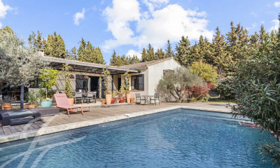 À seulement quelques minutes à pied du coeur du village d'Eyragues, cette propriété de caractère, bâtie dans les années 90, s'intègre harmonieusement dans un environnement verdoyant et paisible de près de 3000 m². Derrière sa belle façade en pierre se cache une maison soigneusement entretenue, pensée pour offrir un cadre de vie confortable et fonctionnel. L'espace intérieur comprend trois chambres lumineuses, un bureau polyvalent (facilement aménageable en chambre supplémentaire), ainsi qu'une buanderie et un garage pratique. L'espace de vie principal, baigné de lumière grâce à son exposition plein sud, s'ouvre sur l'extérieur et offre une atmosphère conviviale. La maison bénéficie d'un excellent confort thermique grâce au double vitrage généralisé et à la climatisation, bien que son implantation lui confère naturellement une bonne fraîcheur en été. Le jardin, richement arboré, accueille une grande terrasse idéale pour les moments de détente ou les repas en famille. La piscine, élégamment intégrée au jardin, est accompagnée d'un espace dédié avec cuisine d'été, parfait pour recevoir dans une ambiance détendue. Un bâtiment indépendant complète l'ensemble : il abrite deux suites confortables avec accès direct à la piscine, préservant l'intimité des invités ou des membres de la famille. Une salle de sport avec salle d'eau attenante peut également être adaptée selon vos projets (chambre, atelier, etc.). Enfin, un vaste garage de près de 200 m² offre de nombreuses possibilités de stationnement ou de stockage. Cette propriété soignée, aux prestations complètes, séduira les amateurs de tranquillité et de charme, à deux pas d'un village provençal dynamique.