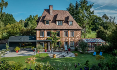 Entre Pont-l'Évêque et Lisieux, jolie propriété édifiée en position dominante sur 6 425 m² de terrain clos et arboré offrant une vue dégagée sur le Pays d'Auge, composée d'un beau manoir du XVIIIe siècle de 196 m² et d'une maison d'amis de 51 m². Manoir sur trois niveaux : cuisine indépendante équipée avec cheminée, arrière-cuisine, salon avec cheminée, vaste pièce de réception ayant fait l'objet d'une extension de type contemporain, jardin d'hiver, 5 chambres dont deux avec cheminées, deux salles de bains. Maison d'amis sur deux niveaux : séjour avec poêle à bois, cuisine ouverte, salle d'eau, mezzanine, chambre avec placards. Atelier et remise attenants avec accès par l'extérieur. L'ensemble est exposé plein sud. Verger sur la partie basse du terrain avec bâtiment à usage de stockage, terrain piscinable.