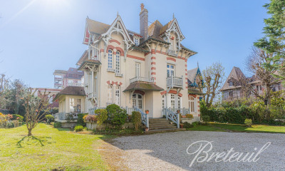 A proximité de Deauville, dans un domaine calme et sécurisé avec gardien et tennis, maison de construction traditionnelle, offrant environ 240 m² habitables sur un terrain naturel de 2.300 m² entièrement clos et arboré, sans vis-à-vis, exposé ouest, pouvant accueillir une piscine. Le rez-de-chaussée offre une entrée/bureau/bibliothèque, un salon avec cheminée, une cuisine dinatoire avec son arrière-cuisine, une salle-à-manger et une chambre de plain-pied avec sa douche et ses toilettes. Et toutes ces pièces s'ouvrent sur l'extérieur, sur une grande terrasse avec jacuzzi pavée plein soleil et son jardin bien exposé et sans aucun vis-à-vis. A l'étage, un vaste palier dessert 5 chambres, un bureau, 2 salles de bains, 1 douche. Un immense garage pour les amateurs de voiture avec ses nombreuses ouvertures (et son pont et pouvant abriter 4 voitures de collection) de 80 m² au sol et surface aménageable à l'étage complète cette propriété. Ce dernier peut être transformé en piscine intérieure, salle de sport ou autres.