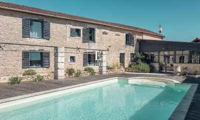 Entre Angoulême et Bordeaux, un ensemble immobilier comprenant un château du 19e s., une chapelle, des dépendances, un bâtiment de 12 000 m² et un parc, sur 51 ha boisés. Passé un hameau de quatre maisons d'habitation, se dévoile l'entrée du domaine. La grille franchie, une allée de 500 m de long mène au château. Au nord de ce dernier, le parc, resté à l'état sauvage, est planté de grands arbres dont des chênes et des pins. En contrebas de la bâtisse principale, au sud, un bâtiment du 20e s. fait face à la grande forêt. Au sud de l'ensemble immobilier, une maison est édifiée en lisière des bois, tandis qu'à l'est, sont implantées diverses dépendances : bâtiments annexes à usage d'ateliers, de garages, de lingerie. Plus au sud, dans les bois, est installée une station d'épuration.