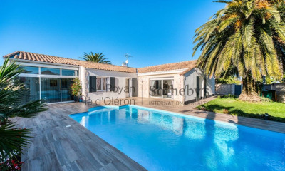 Royan Ile d'Oléron Sotheby's International Realty vous propose en exclusivité, à proximité immédiate du coeur historique de Saint Pierre d'Oléron et de ses rues commerçantes, et 5 kilomètres de Royan Ile d'Oléron Sotheby's International Realty vous propose en exclusivité, à proximité immédiate du coeur historique de Saint Pierre d'Oléron et de ses rues commerçantes, et 5 kilomètres de l'Océan, cette villa de construction traditionnelle édifiée en 2014 sur plus de 700 m² de terrain clos et arborés, agrémentés d'une piscine chauffée et d'une cuisine dînatoire extérieure couverte, idéale pour recevoir famille et amis. Entièrement de plain-pied, située dans une impasse calme avec la campagne et sa vue dégagée pour voisins, son entrée ouvre sur une large et lumineuse pièce de vie avec cuisine équipée, salle à manger et salon/cheminée. L'originalité de cette villa réside en son patio central au plafond de verre qui dessert les trois chambres, la suite parentale et les salles d'eau. Cet espace, lieu central du foyer confère caractère convivial familial et festif à cette maison hors de l'ordinaire. Douceur de vivre garantie ! Une buanderie, un local technique, un garage et sa pièce de rangement/atelier attenante complètent ce bien.