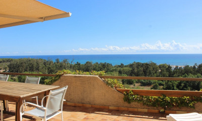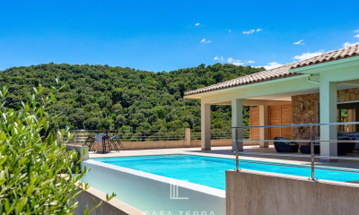 RV1363 – Solenzara Au cœur de la côte orientale corse, dans un cadre naturel préservé entre mer et montagne, cette propriété bénéficie d’une vue spectaculaire et sans vis-à-vis. La villa de plain-pied d’environ 160 m² se compose d’un vaste séjour lumineux, d’une cuisine américaine équipée, d’une buanderie, d’un cellier et de quatre chambres, dont une master-room, avec deux salles de bains. Toutes les pièces s’ouvrent sur une grande terrasse avec piscine chauffée à débordement offrant un panorama sur la mer. En rez-de-jardin, deux appartements indépendants, un T3 et un T2 totalisant environ 112 m², permettent d’accueillir famille ou invités. Édifiée sur un terrain paysager d’environ 2 410 m², la propriété allie tranquillité et panoramas exceptionnels, à proximité des plages immaculées de la côte. Honoraires à la charge du vendeur.