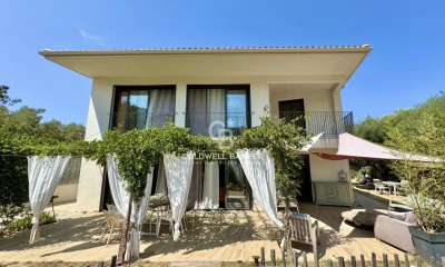 Votre agence immobilière Century 21 Dary Immobilier vous propose une magnifique villa de plain-pied alliant lignes épurées et élégance, les pieds dans l'eau. Située dans l'une des marines les plus prisées de Corse, cette villa d'exception se distingue par son architecture moderne et son emplacement privilégié avec un accès direct à la mer ainsi qu'une vue panoramique à couper le souffle sur la Méditerranée. Dès l'entrée, vous serez séduit par un vaste espace de vie lumineux d'environ 95m² . Le salon baigné de lumière grâce à de grandes baies vitrées s'ouvre sur une belle terrasse et une piscine à débordement avec en perspective la mer ! La cuisine ouverte, entièrement aménagée et équipée avec des matériaux de haute qualité, permet de profiter d'un cadre de vie contemporain et fonctionnel. La villa comprend cinq suites parentales, chacune offrant une vue imprenable sur la mer. Chaque suite dispose d'une chambre, d'un dressing sur-mesure, et d'une salle de bains avec des finitions haut de gamme. Un jardin paysager soignée entoure la villa, créant un écrin d'intimité. Un grand garage complète ce bien. Vous serez séduits par ses prestations de standing, ses parements en pierres habillant les façades et sa situation pied dans l'eau ! Prix : 4500000.0 euros, Honoraires charge vendeur.