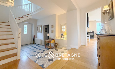 CÔTE & BRETAGNE IMMOBILIER VOUS PROPOSE MER ET VOLUME Une maison de charme rénovée, à quelques pas du port de Saint- Quay Portrieux Idéalement située à seulement cinq minutes à pied du port de Saint-Quay Portrieux et de sa plage, cette maison de 1850 a su traverser le temps avec justesse. Réinventée par une rénovation complète et des extensions harmonieuses, elle offre aujourd'hui un cadre de vie fluide, lumineux et parfaitement adapté aux exigences contemporaines, dans un environnement maritime privilégié. Saint-Brieuc se rejoint en vingt-cinq minutes, et la ligne TGV Paris Saint-Brieuc permet de rallier la capitale en 2h06. Volumes repensés et circulation naturelle Dès l'entrée, le ton est donné : l'espace est là, maîtrisé, ouvert, sans excès. Les pièces de vie s'articulent avec évidence autour d'une circulation centrale. Le salon principal, baigné de lumière grâce à de larges baies vitrées à galandage, s'ouvre directement sur une terrasse orientée plein sud, prolongeant la vie intérieure vers l'extérieur. À ses côtés, la salle à manger et la cuisine, aménagée et équipée avec des prestations haut de gamme, participent à une ambiance chaleureuse et fonctionnelle. Un second salon, plus intime, complète les espaces de détente. Une arrière cuisine bien pensée et discrète s'intègre parfaitement au rez-de-chaussée. Une maison familiale, en parfaite cohérence Le premier étage accueille une suite parentale confortable, avec un vaste dressing et une salle de bains complète (douche et baignoire), formant un véritable espace nuit indépendant ou suite parentale. En rez-de-jardin, trois chambres supplémentaires bénéficient d'une belle luminosité. Certaines disposent de leur propre salle d'eau, les autres se partagent une salle d'eau commune. La distribution, claire et équilibrée, assure à chacun calme et intimité. Une vaste buanderie très bien pensée se loge à ce niveau Extérieurs soignés et dépendances utiles À l'arrière, le jardin arboré dévoile ses essences anciennes et ses recoins paisibles. Il offre un cadre agréable à vivre au quotidien, sans entretien excessif, tout en permettant d'envisager des usages variés selon les saisons. Un studio indépendant, aux usages multiples Attenant à la maison, un studio entièrement équipé avec kitchenette, salle d'eau et WC offre une belle autonomie. Il pourra accueillir confortablement des invités, loger un adolescent ou un membre de la famille, ou encore constituer une source de revenus intéressante dans le cadre d'une location saisonnière ou à l'année, selon les projets de ses futurs occupants. Il peut être aussi utilisé comme un bureau pour une activité professionnelle. Un vaste garage, de multiples possibilités Véritable atout rare sur ce secteur, le garage d'environ 140 m2 offre un volume impressionnant, permettant d'abriter plusieurs véhicules, bateaux, remorques ou équipements de loisirs. Il conviendra également parfaitement à un artisan souhaitant disposer d'un espace de stockage sécurisé et indépendant, ou à des propriétaires de résidence secondaire cherchant une solution pratique pour hiverner leur bateau, vélos, voitures ou matériels divers, à l'abri et en toute tranquillité. Un cadre de vie équilibré, entre mer, confort et sérénité La maison est en excellent état, parfaitement entretenue, et ne nécessite aucun travaux. Elle offre un mode de vie paisible, à proximité immédiate des commerces, des écoles, du littoral et des chemins côtiers. Un environnement côtier vivant et dynamique La station balnéaire de Saint-Quay-Portrieux, offre un cadre de vie agréable toute l'année. Le port en eau profonde, la plage accessible à pied, et l'école de voile participent à une atmosphère marine active. Le casino et les nombreuses animations estivales apportent une vie culturelle et festive dès les beaux jours, tandis que les commerces et infrastructures permettent une installation en résidence principale sans compromis. Dans les environs, les amateurs Côte et Bretagne Immobilier, votre agence immobilière de prestige en Bretagne. Vous souhaitez vendre ou acheter une maison en bord de mer, contactez-nous. Une équipe professionnelle à votre service.