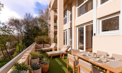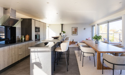 Le salon, aux lignes résolument contemporaines, impressionne par sa hauteur sous plafond et ses larges ouvertures sur le jardin anglais exposé sud. Baigné de lumière, il invite à des moments de partage dans une atmosphère à la fois élégante et chaleureuse.