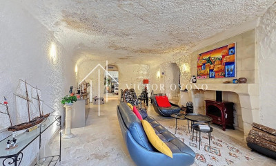 La partie troglodyte d'une surface de 140m² offre une salle à manger d'environ 40 m² avec cuisine aménagée et équipée, cellier et poêle à bois ; un vaste salon lumineux de 40 m², également équipé d'un poêle à bois, ouvrant sur la terrasse plein sud en pierre de travertin ; une suite parentale d'environ 40 m² avec dressing et salle de bains (baignoire, douche, WC suspendu) ; un salon de lecture avec rangements, un WC séparé et un local technique.