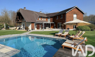 iad France - Armelle Lecuyer vous propose: Véritable écrin de verdure à l'abri des regards, cette propriété de 290m2 habitables (457m2 au sol) aux prestations haut de gamme et à la décoration soignée est un havre de paix niché dans un charmant village du Vexin.