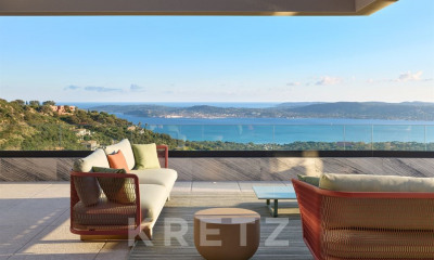 Immense terrasse avec une vue panoramique sur la mer et la baie de Saint-Tropez.