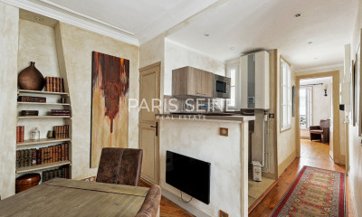 Charmante 2-Zimmer-Wohnung mit kleinem Außenbereich, nur einen Steinwurf vom Jardin du Luxembourg entfernt, in einem ruhigen Innenhof im Odéon-Viertel im 1. Stock eines schönen, gepflegten Gebäudes. Die Wohnung besteht aus einem Eingangsbereich, der zu einem Wohnzimmer mit offener Küche, einem Schlafzimmer, einem Badezimmer und einem separaten WC führt. Die Sichtbalken wurden erhalten und die Immobilie wurde sorgfältig renoviert. Ein Abstellraum im Treppenabsatz und ein Keller runden diese Unterkunft ab. Ideal als Zweitwohnung oder charmante Investition.