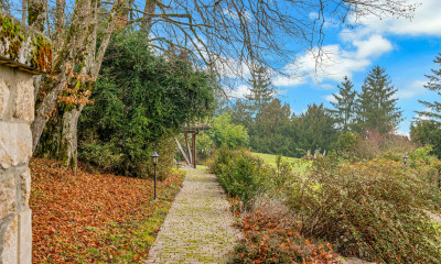 Der mehr als viertausend Quadratmeter große Park ist eines der wichtigsten Identitätsmerkmale dieses Anwesens. Der mit Bäumen bepflanzte, sorgfältig gestaltete Park wurde als Ort zum Flanieren konzipiert und ist von gepflasterten Wegen durchzogen, die zum Spazierengehen einladen. Die Steine aus dem Jura, die sorgfältige Auswahl der Baumarten und die Bepflanzung bilden eine strukturierte, aber lebendige Landschaft, in der jede Jahreszeit ihren eigenen Reiz entfaltet. Der Blick fällt ganz natürlich auf offene Perspektiven und intimere Bereiche, die vor neugierigen Blicken geschützt sind. Die großzügig dimensionierte Terrasse wird zu einem eigenständigen Empfangsbereich. Sie grenzt an den Außenpool und öffnet sich zu den umliegenden Bergen, sodass man einen Panoramablick auf die Alpenlandschaft genießen kann. Der Park verfügt außerdem über seltene Einrichtungen, die für das Wohlbefinden und die Sicherheit der Tiere konzipiert wurden. Das Ganze bildet einen stimmigen, eleganten und funktionalen Außenbereich, in dem die Natur nie nur dekorativ ist, sondern voll und ganz bewohnt wird und die Innenarchitektur in einer sinnvollen Kontinuität fortsetzt.
