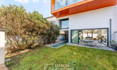 Eingebettet im Herzen des begehrten Ortes Champagne-au-Mont-d'Or besticht dieses moderne, 180 m² große Stadthaus aus Sichtbeton durch seine markante Architektur, die klare Linien und großzügige Raumwirkung vereint. Schon beim Betreten des Hauses spürt man die einladende Atmosphäre: Dank der beeindruckenden Deckenhöhen durchflutet Licht die Räume und betont die natürlichen Materialien und die Weite des Raumes. Der Wohnbereich, ein wahrer Mittelpunkt der Geselligkeit, gruppiert sich um ein weitläufiges, offenes Wohnzimmer, in dem Innen- und Außenbereich fließend ineinander übergehen. Die Küche mit ihren klaren, modernen Linien fügt sich perfekt in das Gesamtkonzept ein und erweitert die Wohnbereiche, die für ein offenes und modernes Wohngefühl konzipiert wurden. Auf der Schlafebene bietet das Haus derzeit vier Schlafzimmer, mit der Möglichkeit, ein fünftes nach Ihren Wünschen einzurichten: als Büro, zusätzliche Suite oder als separater Freizeitraum. Jedes Zimmer ist komfortabel und privat gestaltet und besticht durch einen minimalistischen, aber dennoch einladenden Stil. Zwei Duschbäder und ein Badezimmer vervollständigen diese Etage. Im Außenbereich befindet sich ein elegant gestalteter Swimmingpool, der eine natürliche Erweiterung des Hauses darstellt und ideal für sonnige Tage und Momente der Entspannung in absoluter Privatsphäre ist. Ein seltenes Anwesen mit beeindruckender Architektur, bei der Sichtbeton zu einem edlen und zeitlosen Material wird, im Herzen einer begehrten Gegend, nur wenige Schritte von allen Annehmlichkeiten und Lyon entfernt. Eine diskrete Adresse für alle, die einzigartige Immobilien zu schätzen wissen. Parkplätze sind auf dem Grundstück vorhanden, eine Garage in der Nähe kann separat erworben werden. ENERGIEBEZEICHNUNG: C / KLIMABEZEICHNUNG: C. Geschätzte durchschnittliche jährliche Energiekosten bei Standardnutzung, basierend auf den Energiepreisen für 2021, 2022 und 2023: Zwischen x und x Euro. Kontakt: Clément +33 6 68 34 94 29